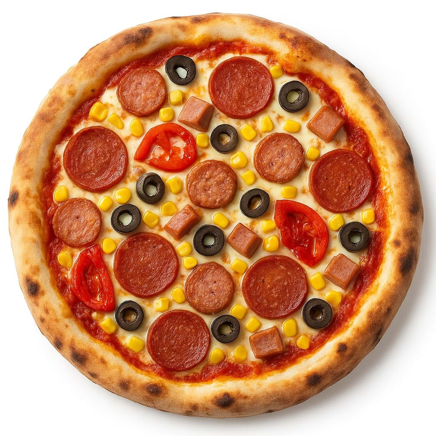 İçindekiler:PİZZA TABAN(%54,5)[Buğday Unu (Gluten), Su, Zeytinyağı, Tuz,Maya], pizza sosu : [domates salçası, domates püresi, stabillizatör, modifiye nişasta, biber salçası, fosforik asit, baharat, Üst malzeme (%45,5): [tam yağlı eritme peyniri , sucuk(Dana eti ve yağı, baharat karışımı, tuz,sarımsak,stabilizör, antioksidan ve koruyucu, sosis (Dana eti ve yağı, baharat karışımı,patates nişastası, tuz, ayçiçekyağı,su, stabilizör, kıvam arttırıcı, soya proteini,antioksida,doğal tütsü aroma vericisi,koruyucu,süt proteini ve renklendirici, közlenmiş kapya biber, mısır, zeytin .